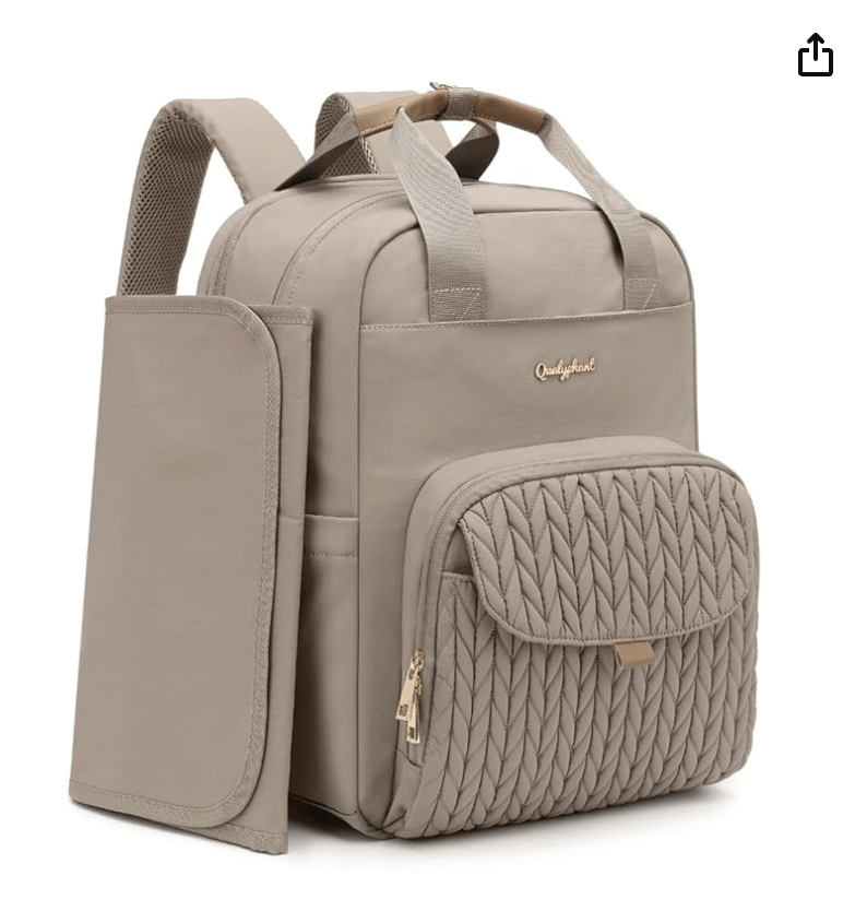 I love this one for multiple children for the extra space. It comes in a variety of cute colors (Khaki is my personal favorite on this one!) and has the extra bells and whistles to make it useful too. Again, backpack style because it is much easier to throw it on your back when you’re trying to get everyone moving towards the bathroom!