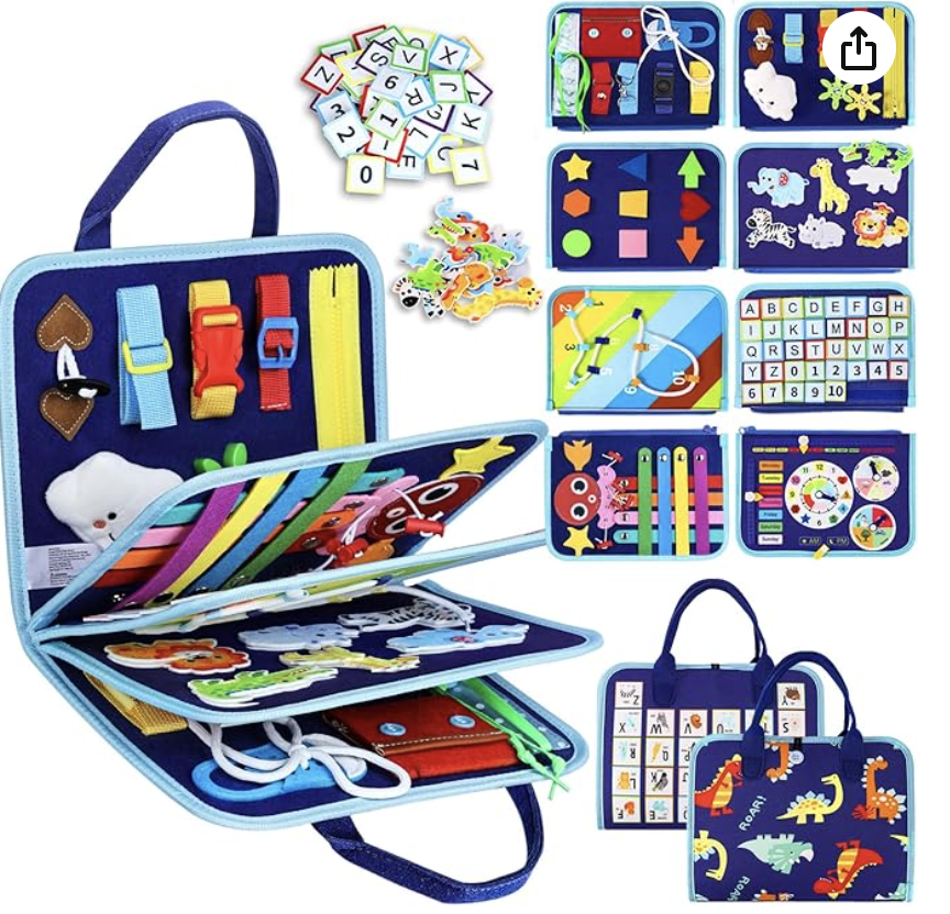 These busy books are a hit for the kids, but I will add a warning- when they’re little it’s a lot of little pieces that get thrown all over and having to organize them again drives me insane. However, when I’m desperate they are good because they do keep them entertained!
