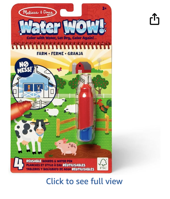Finally, these water books! Super easy to keep them entertained for a longer period of time, and virtually mess free. Also, who doesn’t love getting to reuse something again and again? They’re cheap, and my kids love getting new ones! Get it here